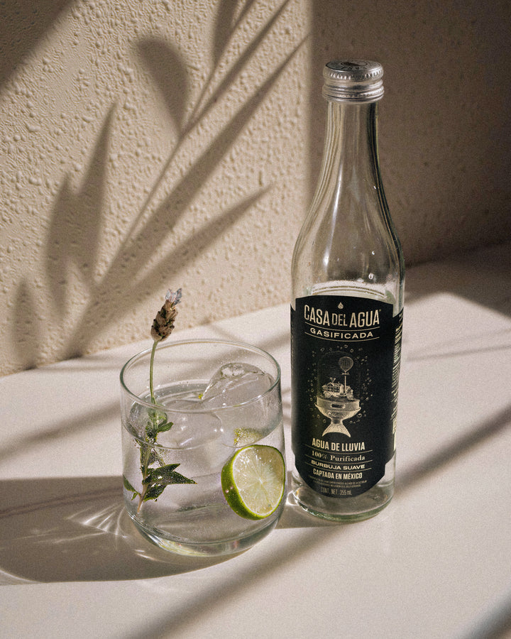 Our soft-bubbled version is a celebration of the essential: water. Rainwater , responsibly collected in Mexico City, purified and delicately carbonated to offer a light, natural, and elegant experience.